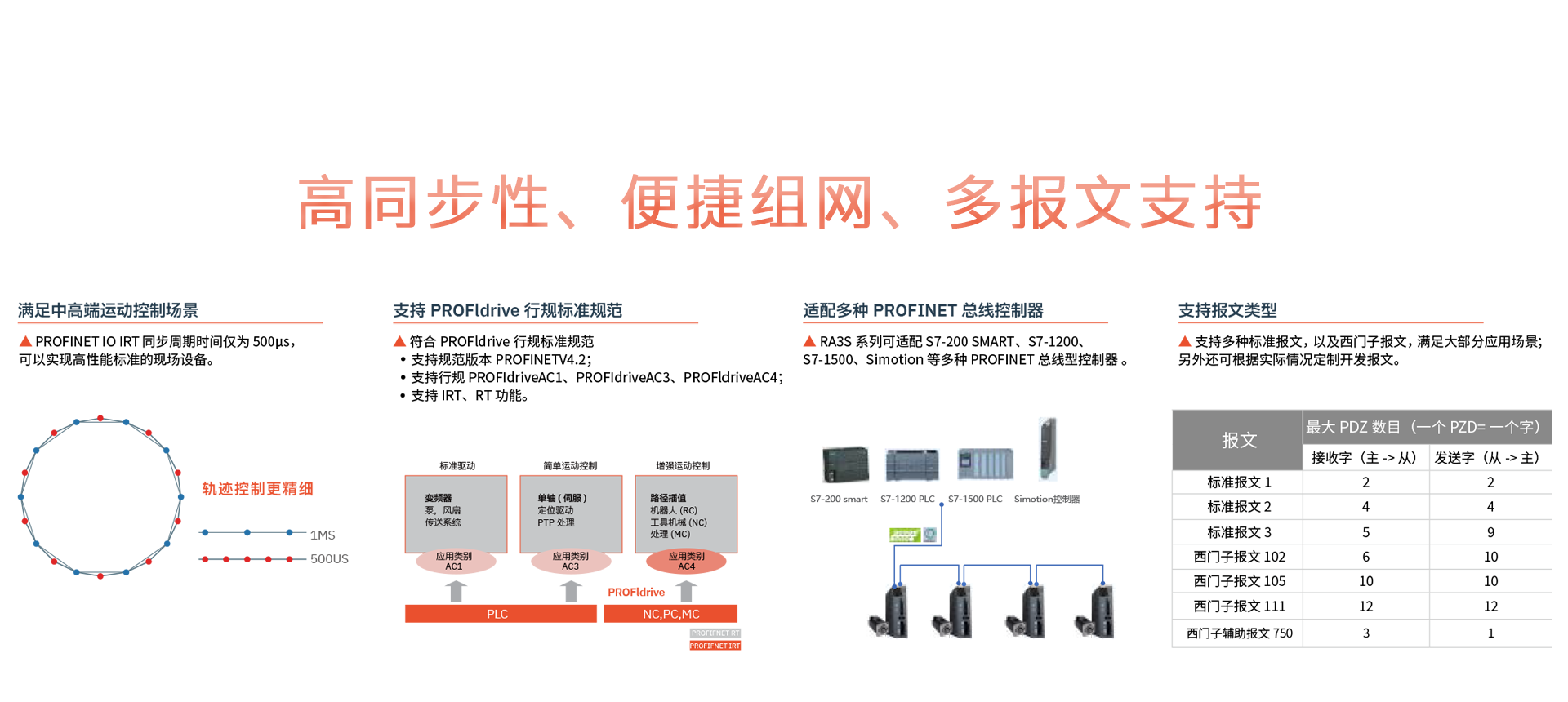 該系列產(chǎn)品支持PROFINET通訊協(xié)議,提供了剛性表、慣量辨識、自動增益調(diào)整等功能,使驅(qū)動器簡單易用。
