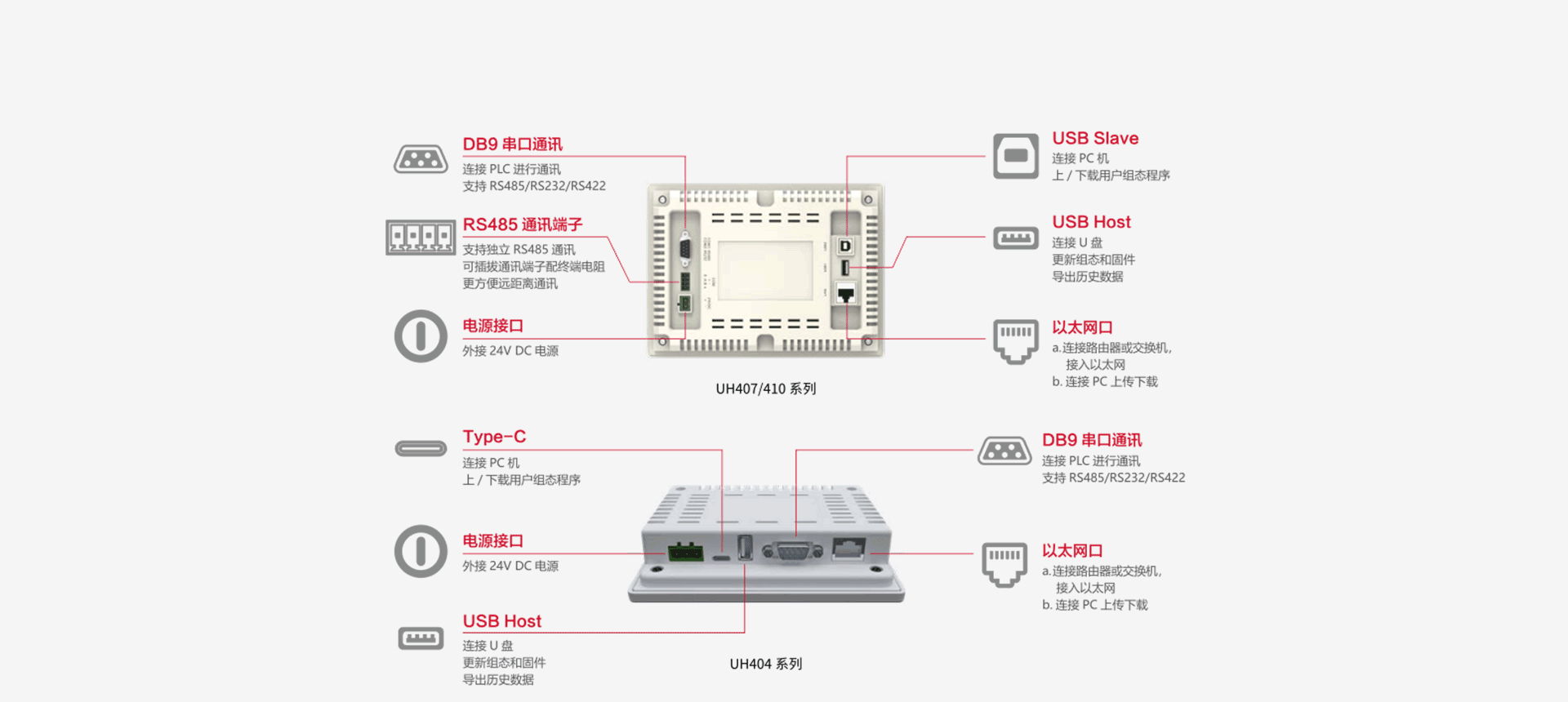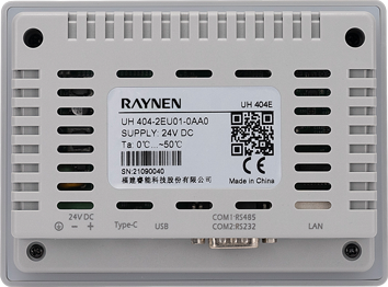 | UH 404E | 4.3"TFT | 480×272 | USB2.0×1,Type A(USB1),支持U盤更新固件、組態和存儲數據 | Type C,支持供電、程序上下載 | COM1:RS485 COM2:RS232 | 10M/100 M自適應 | 138×101×32mm | |